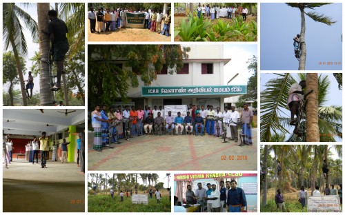 ICAR-SCAD, Krishi Vigyan Kendra, Thoothukudi and Coconut Development Board jointly organized six days training programme to coconut growers for tree climbing by using Friends of Coconut Tree (Tree climber). 20 beneficiaries of Coconut growers from TN Kulam were selected for the training. This village is adopted by KVK under the programme of “Doubling farmers income by 2022”. In this village various technologies for agriculture, horticulture and animal science are being implemented by scientists of SCAD KVK. The selected coconut farmers were given six days training in the KVK campus. In this training, technologies in coconut cultivation, pest and disease management and recycling of farm waste were covered. In valedictory function Technical Officer from the Coconut Development Board Mr. Bharathipriyan, Senior scientist and Head Dr. V. Srinivasan, Scientists P. Velmurugan, A. Murugan, PK. Muthukumar and C. Bhagavathsingh were awarded certificates to the participants. Prizes were awarded to the winners of the coconut Olympics competition. Coconut tree climbing equipment was provided to all beneficiaries at the end of the programme. The training was organized by the advice of Dr. Cletus Babu, chairman of SCAD trust and executed by the scientists and technical staff of the Krishi Vigyan Kendra, Thoothukudi.
