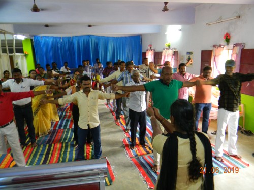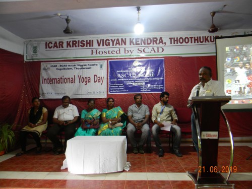 Thoothukudi district Animal husbandry department along with ICAR SCAD KVK conducted district level animal disease prevention awareness campaign on 21st June 2019. Around 80 farmers and 15 extension functionaries participated in this campaign and international yoga day celebrations. Assistant Director of Animal husbandry animal disease investigation unit Dr.SanthoshMuthukumar delivered welcome address then Miss. Anu Nair explained the importance of yoga practices and demonstrated simple yoga exercises to the participants and all the participants learned about the simple yoga practices. Assistant director of Animal Husbandry, Kovilpatti division Dr.V. Shankara Narayanan, Vet Surgeon Dr.S.Boothalingam delivered felicitation address to the gathering. Joint Director of Animal Husbandry Thoothukudi delivered presidential address and asked the participants to follow the disease prevention practices, especially for the control of foot and mouthdisease in cattle andranikhet disease in poultry for which Animal husbandry department is regularly carrying out vaccination in all the villages and all the dispensaries.